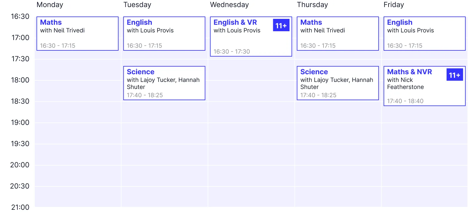 - Year 5: Maths, Science, English, 11+